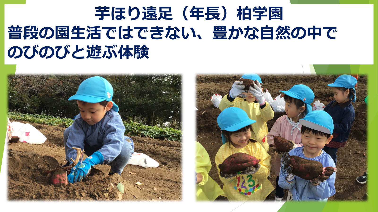 土を掘って出てきたサツマイモの大きさにびっくりしたり、森の中を探検してドングリや葉っぱを見つけたり、芝生を走ったり転がったり、、、日常生活ではなかなかできない、貴重な自然体験ができました😊